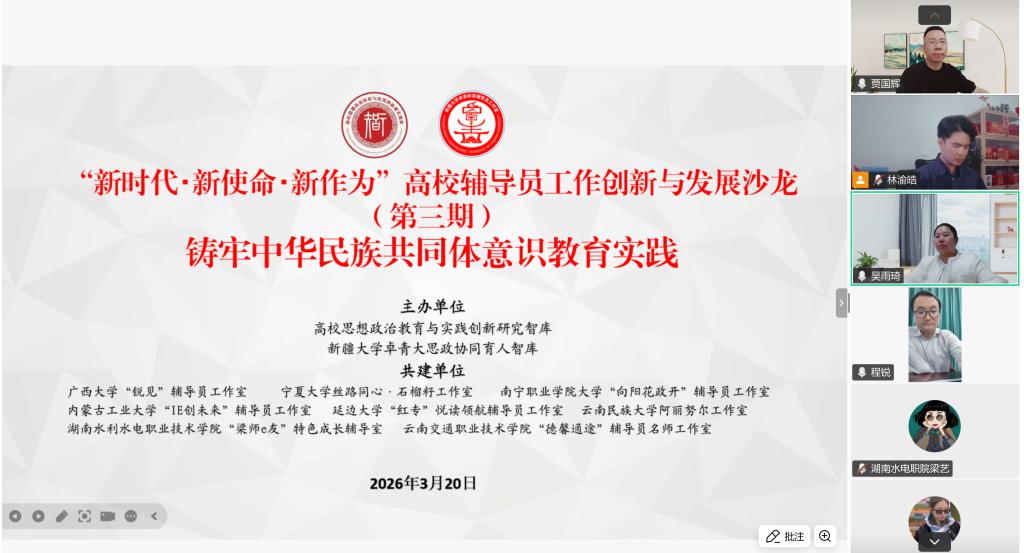 近日,“新时代·新使命·新作为”高校辅导员工作创新与发展沙龙(第三期) 线上成功举行。活动由高校思想政治教育与实践创新研究智库发起,联合全国十余所高校思政工作室联合打造,聚焦铸牢中华民族共同体意识教育实践与思想政治教育融合。英国365集团公司IE创未来辅导员工作室作为联建单位受邀参会,分享思政育人实践经验。