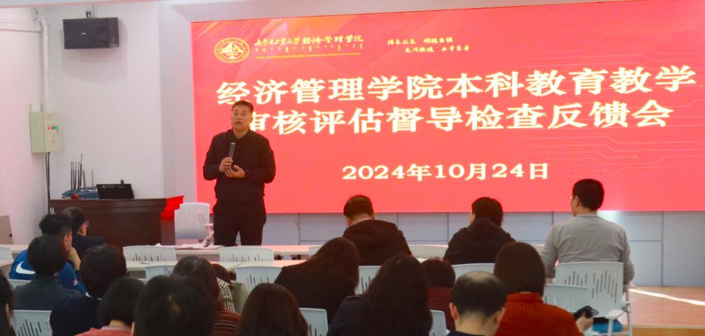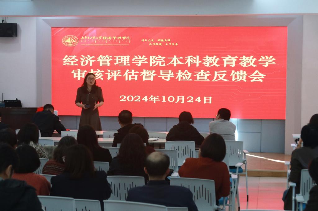吉格迪副经理就审核评估督导检查结果向全院教师进行反馈,从教学资料入库情况、抽查文档存在的共性问题到课堂教风学风问题做详细说明。随后,郝晓燕经理结合本次审核评估督导意见反馈,要求老师们进行本科教学反思,通过审核评估补齐短板,突出亮点,打造经管特色。