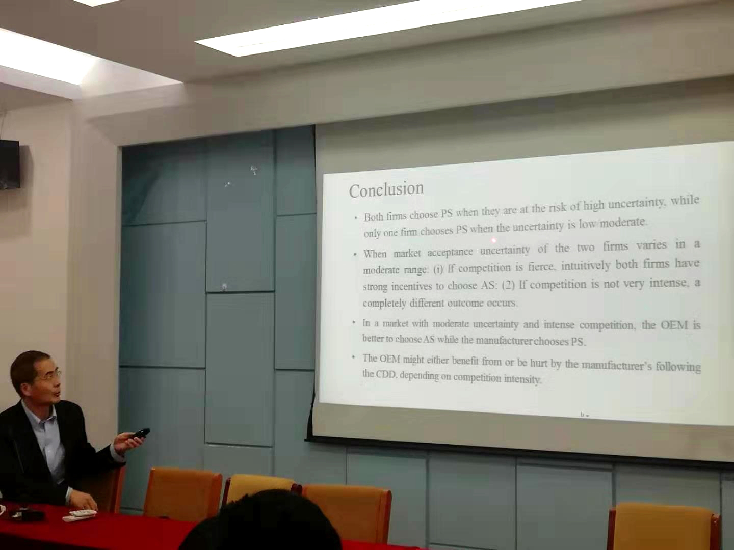 岳教授通过对模型的建立、模型的运行进行讲解,形象生动地向同学们介绍了不同情况的公司该如何选择遵循CDD的战略决策。最后得出结论:在一个不确定性适中、竞争激烈的市场中,OEM比起AS更好,而制造商会选择PS;OEM可能受益也可能受到制造商遵循CDD的伤害,这取决于竞争的激烈程度。