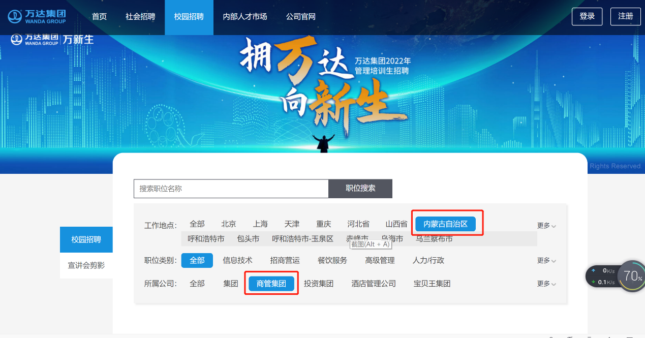 2、简历投递:登录万达官方网站http://wanda.hotjob.cn,所属机构选择商管集团、工作地点选择内蒙古自治区,选择心仪的岗位投递简历即可(如图)