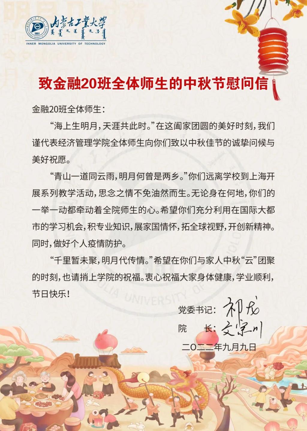 致金融20班全体师生的中秋节慰问信