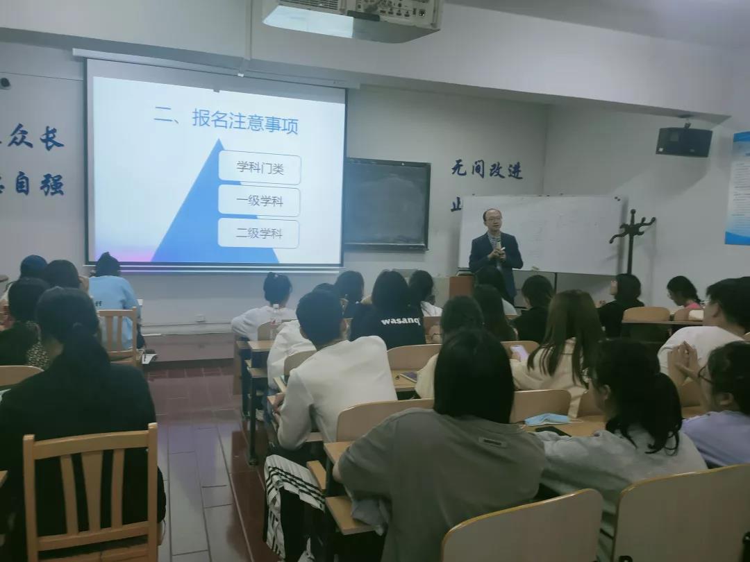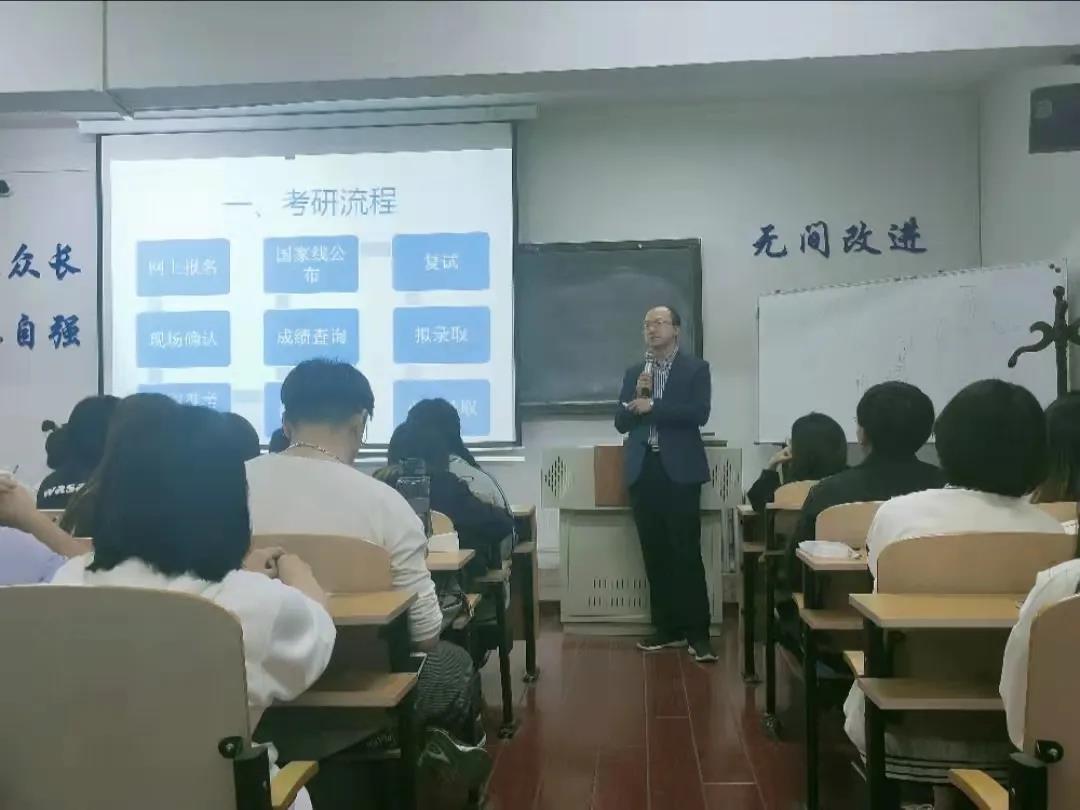 为帮助应届毕业生了解考研流程,合理准确进行考研报考,英国365集团公司于9月22日晚在主楼210教室举办考研指导讲座。段玮老师主讲,部分同学参加。