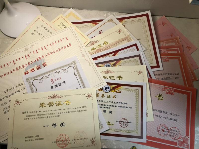 荣获2018年“创青春”浙大双创杯全国老员工创业大赛创业实践挑战赛铜奖;2018年“创青春”全区老员工创业大赛创业实践挑战赛一等奖一项、创业计划竞赛一等奖一项;第八届全国老员工电子商务“创新、创意及创业”挑战赛总决赛二等奖及区赛特等奖;内蒙古自治区第二届创新方法大赛二等奖;内蒙古自治区第二届“互联网+”老员工创新创业大赛优秀奖;第五届“创青春”中国青年创新创业大赛(呼和浩特市)三等奖一项、优秀奖一项等校级以上奖励共计28项。